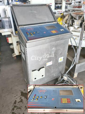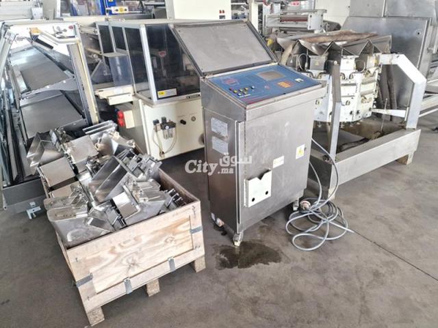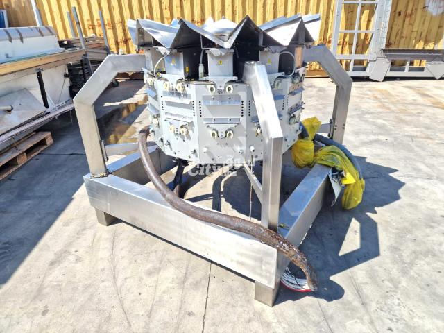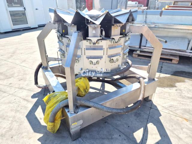نظام تعبئة هوائي متعدد الرؤوس مستعمل، مزود بـ 12 رأسًا للتعبئة والتغليف، بسعة دنيا 50 غرامًا وسعة قصوى 2500 غرامًا، مع لوحة تحكم Simionato S.p.a. MTS 12 تعمل بجهد 400 فولت.