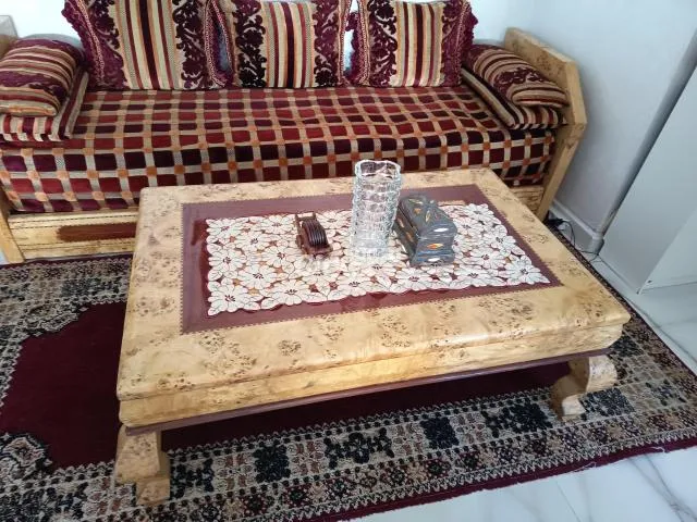 Salon traditionnel marocain en L en bon état comportant deux banquettes (2m50 et 2m30), une table basse rectangulaire (1m26/80cm) et un tapis (2m56/1m23)
