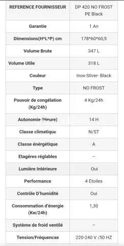 Réfrigérateur la marque : SIERA, Référence Fournisseur : DP 420 NO FROST PE Black ✅️ État : Neuf ✅️ Type : No Frost ✅️ Garantie : 1 Ans ✅️